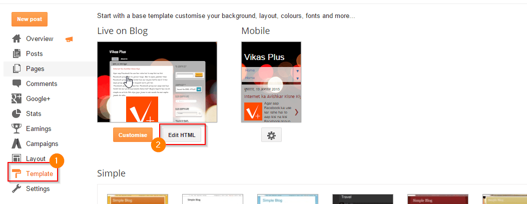 Step 1: Sabse pehle apne blogger account me jaakar login karna hai. FirTemplates > Edit HTML par click kare.