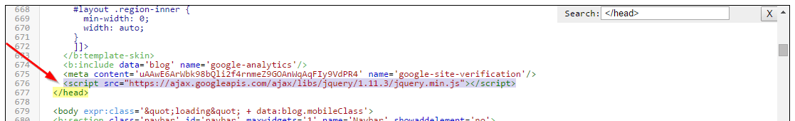 Step 2: Control + F click karke“ajax.googleapis.com/ajax/libs/jquery“ search kare agar kuch nahi milta iska matlab aapke template mai pehle se jQuery nahi lagi hai, aur ab aap apni jQuery laga sakte hai.